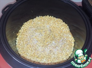Кладем в чашу мультиварки горох, добавляем соль ( я добавила 1 ст. л. без горки), перец по вкусу. Заливаем холодной водой так, чтобы она покрывала горох чуть выше чем на 1 см.