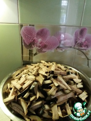 Режем баклажаны со шкуркой, небольшими брусками. -