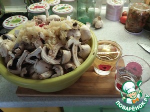 В шампиньоны добавляем горький перец - мелко нарезаный (я резала с косточками, мы любим поострее. Кто не любит, очищаем от косточек), выдавливаем на прессе чеснок, и подготавливаем в стаканы масло и уксус.
