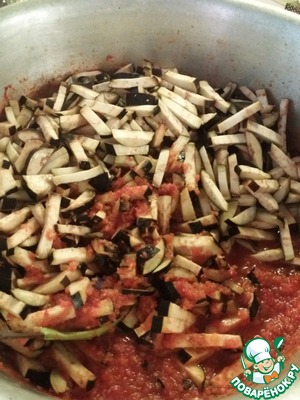 По истечении часа, добавляем в наш соус нарезаные баклажаны. Варим еще 30 мин.