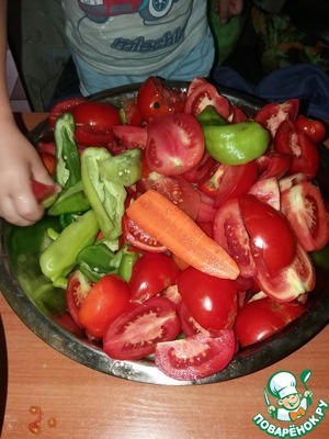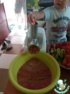 Помидоры, перец, яблоки, морковь - порезать, подготовить и для обработки на мясорубке.