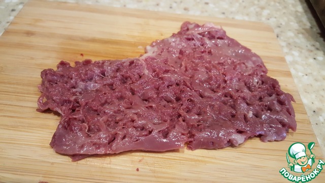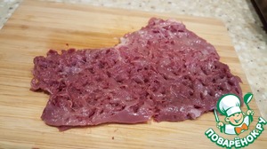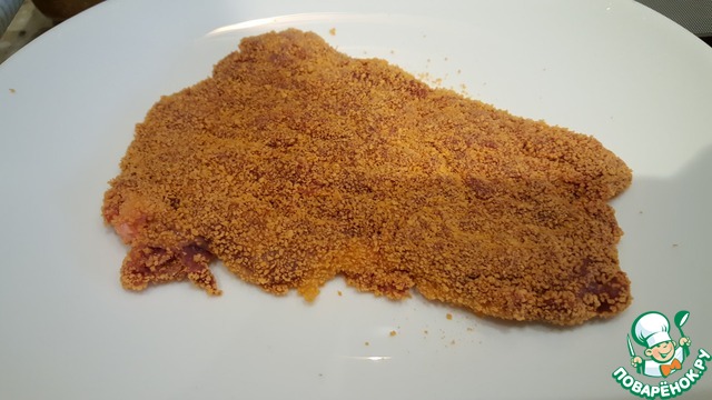 Печень очень аккуратно отбить мелким молоточком, не протыкая до доски. Обвалять в панировочных сухарях.