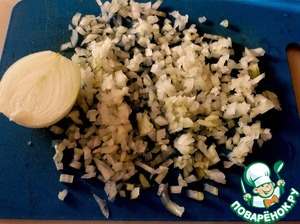 Пока баклажаны запекаются, нарежем, очень мелко репчатый лук.