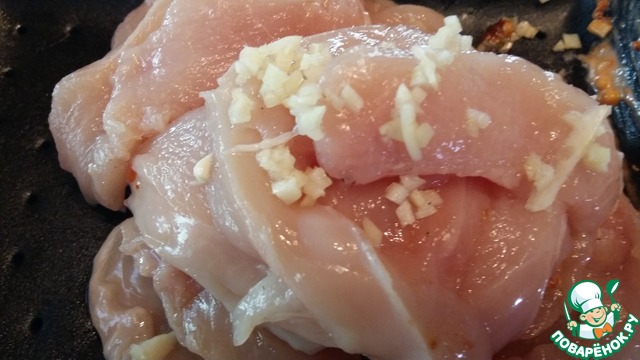Куриную грудку порезать тонкими ломтиками, чеснок мелко порубить.