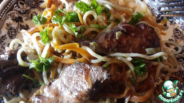 Лапшу перемешать с овощами прямо в сковородке.