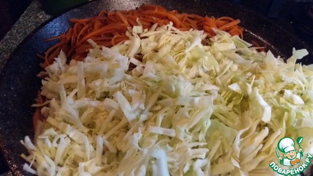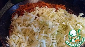В небольшом количестве растительного масла сначала обжарить морковь, затем капусту и все остальное.