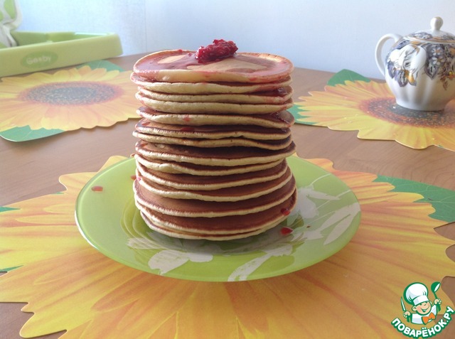 Готовые хотткейки складываем стопкой и поливаем сиропом, мёдом или по вашему вкусу.