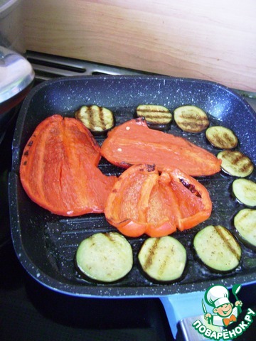 Обжарить на смазанной маслом гриль-сковороде до румяности, перец можно и до легких подпалин. -