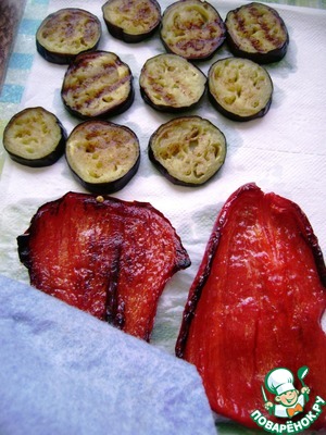 Баклажаны нарезать кружочками толщиной в 0,5 см. перец очистить и разрезать вдоль пополам, расплющить половинки.