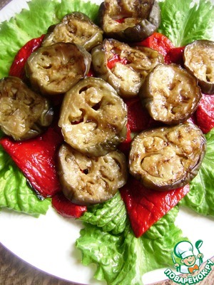 На вымытые и просушенные листья салата выкладываем перец, сверху баклажаны, затем тонкие кружочки плотных помидор.