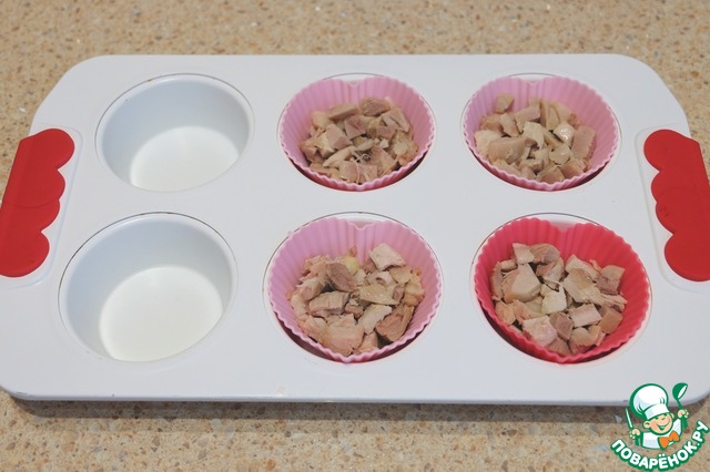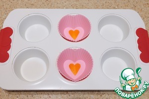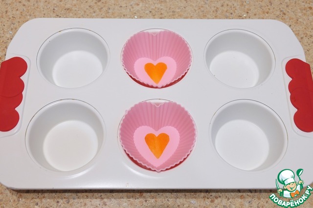 В формочки добавить вырезанные из моркови сердечки, выложить консервированный горошек.