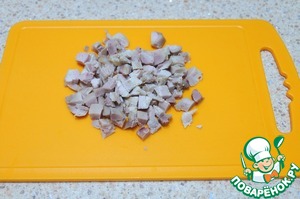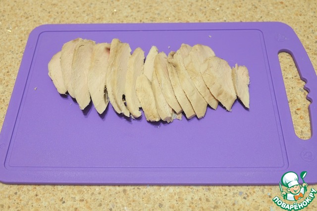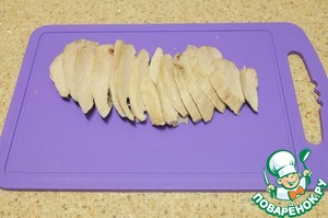 Затем желе с куриным мясом откинуть на блюдо, выложить куриное филе, порезанное брусочками.