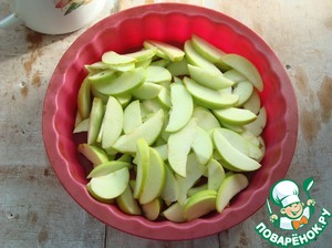 Берём форму. Я беру силиконовую форму или антипригарную, чтобы её не подмазывать. Форма у меня D-20 см и высотой 5 см. Яблоки режем, убираем серединку, можно кожицу снять. Яблоки режу керамическим ножом и они не окислятся, пока я их готовлю для пирога. Выкладываю дольки, порезанные тонко и красиво в форму. Люблю много яблок.