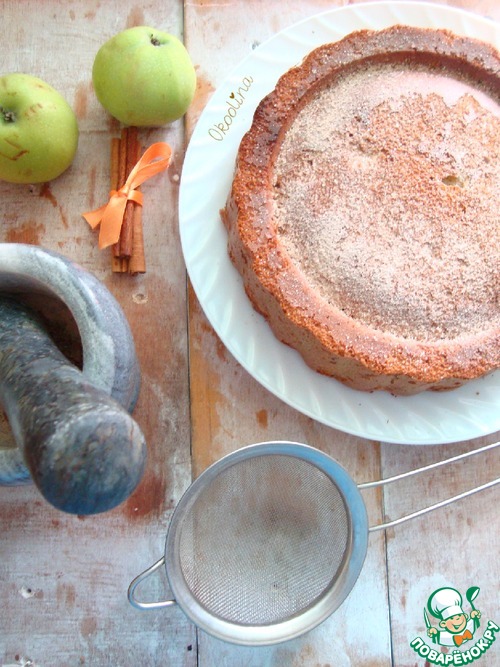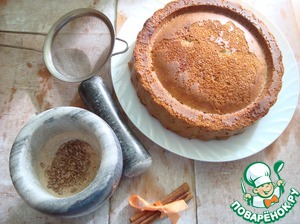 Так как форма у меня для "перевёртышей", я перевернула шарлотку и сняла форму. Этого делать не обязательно. В ступке разбила 1/2 палочки корицы и тростниковый сахар. получилась пудра.