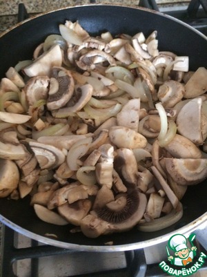 К луку добавить грибы и обжаривать, постоянно помешивая, 3-4 минуты. Сразу переложить охлаждаться в другую ёмкость луково-грибную смесь, чтобы она в сковороде не парилась.