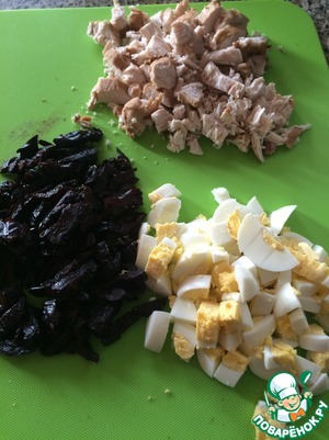 Яйца покрошить достаточно крупным кубиком, а филе и чернослив - соломкой. У меня сегодня филе было всё какое-то неровное, поэтому пришлось его тоже нарезать кубиком.