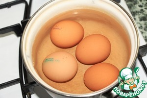 4 яйца залить водой, поставить на огонь и с момента закипания варить ровно С1 - 3 мин., С0 - 4 мин. Не больше!!!