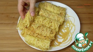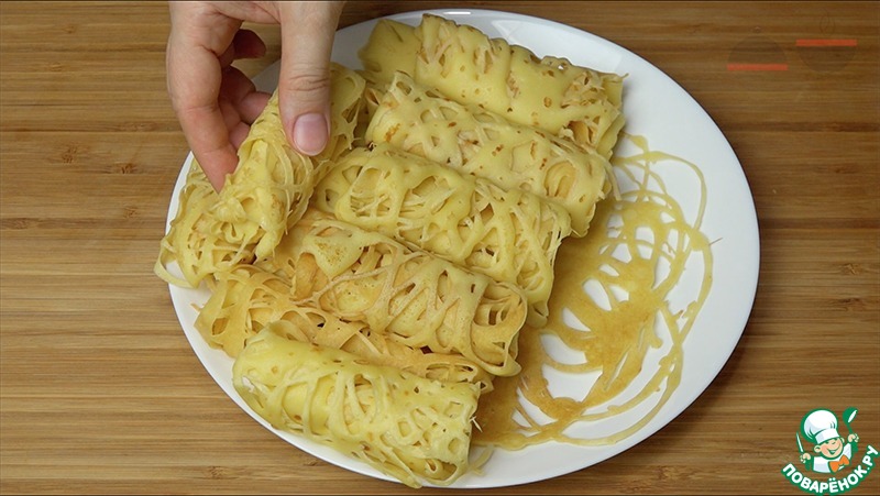 Готовый блинчик выкладываю на стол и сворачиваю. Можно смазать растопленным сливочным маслом (но я обычно не успеваю жарить - не то, что маслом смазывать...) -