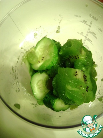 Очищенные киви и огурцы с кожицей пюрировать блендером с листьями мяты до однородности.