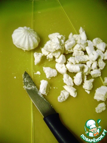 Зефир нарезать небольшими кубиками, опуская нож в горячую воду.