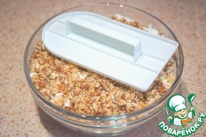 Грецкие орехи измельчить в крошку. Добавить слой измельченных грецких орехов. Кондитерским утюжком или ложкой слегка придавить слои для равномерного распределения майонеза внутри салата. Салат сверху посыпать натертым на терке яичным желтком, украсить по вкусу.