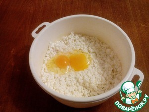 Творог высыпаем в ёмкость, где будет замешиваться тесто, добавляем яйца и хорошо перемешиваем.