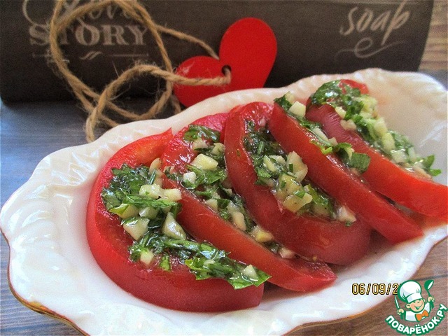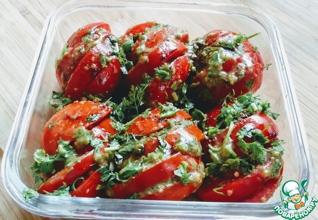 Выкладываем дольки помидоров в посуду, каждую дольку промазываем заправкой, присыпаем зеленью и укладываем дольки башенкой.