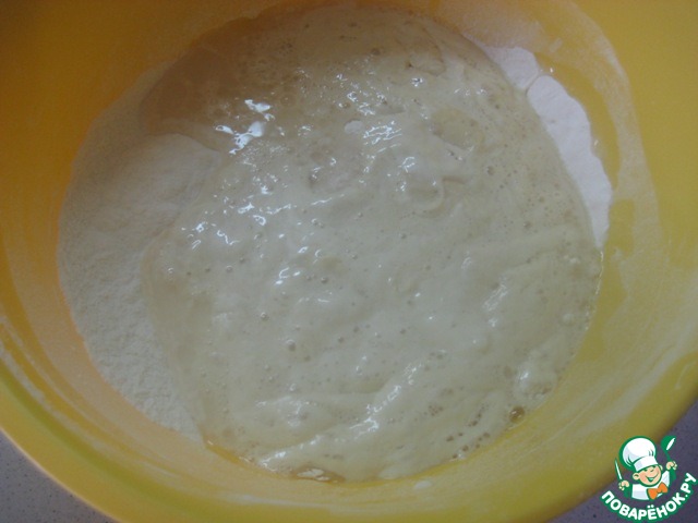 Влить дрожжевую воду в муку и перемешать до однородности. -