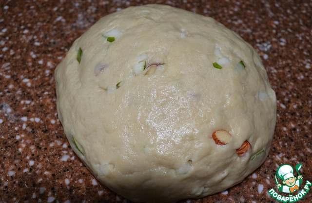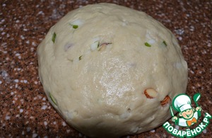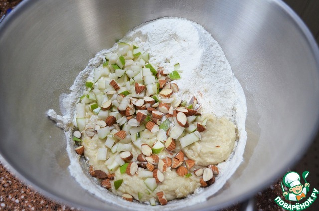 • Высыпать орехи и грушу в тесто, добавить оставшийся стакан муки и вымесить тесто до однородности, на средней скорости, минут 5.
