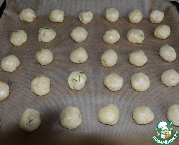От теста отщипывать кусочки (20-22 г), катать в шарики и выкладывать на противень. В заготовке два стандартных противня.