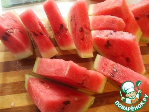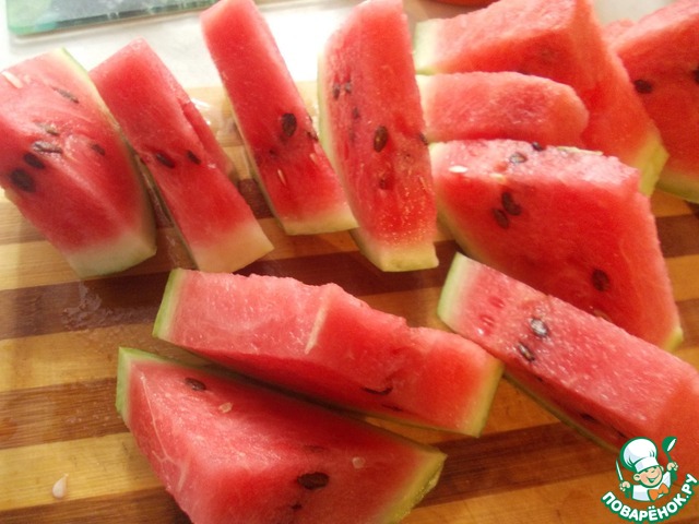Арбуз порезать на небольшие дольки, чтобы они могли пролезть через горлышко.