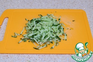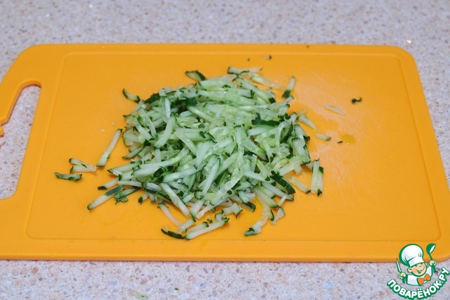 Свежий огурец натереть на крупной корейской терке. Лишнюю влагу слить.