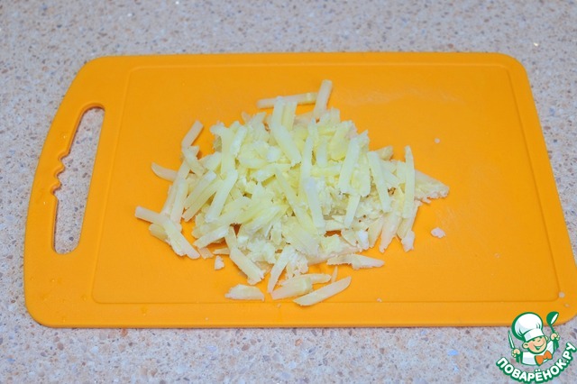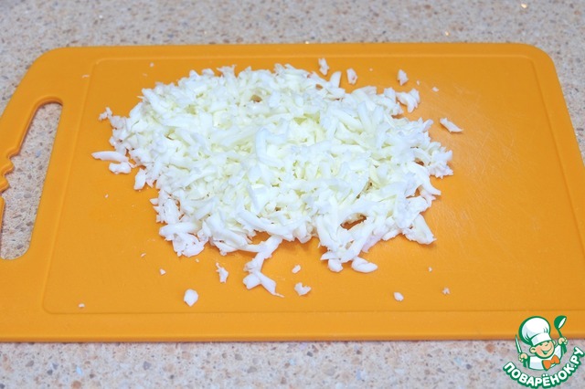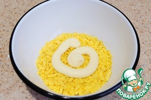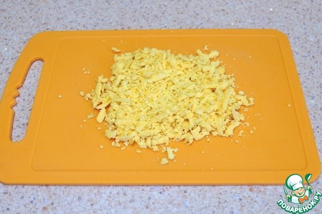 Яйца отварить. Яичный белок натереть на терке.