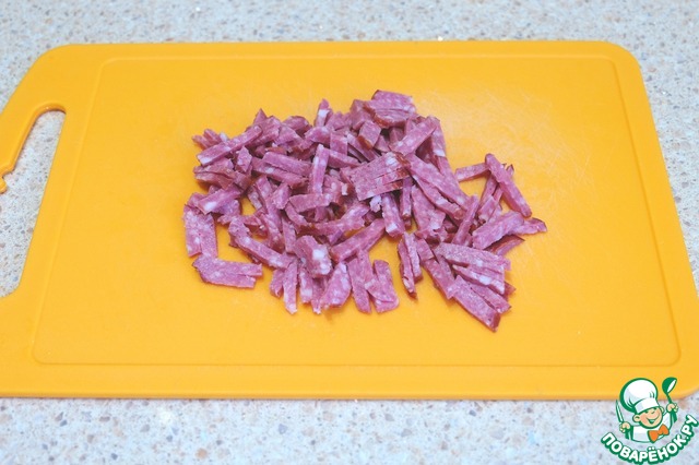 Колбасные изделия порезать тонкими брусочками.
