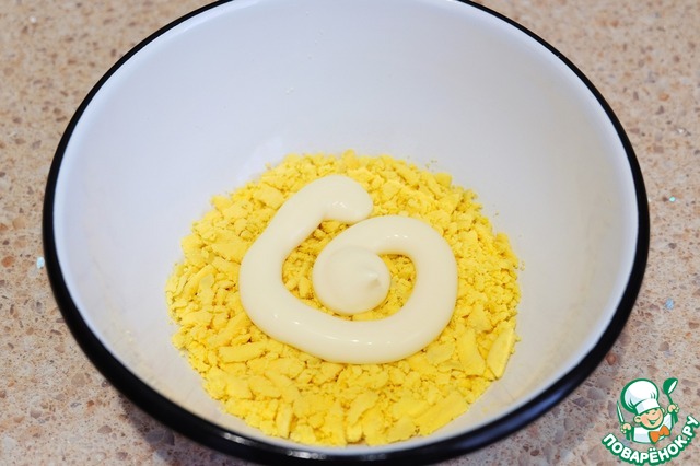 На дно миски выложить слой желтков, смазать майонезом