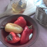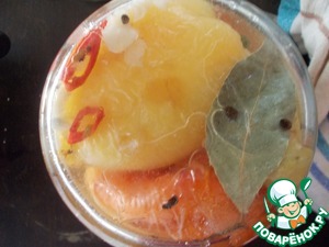 А нынче я откалибровала небольшие перчинки, эти недоросли, конечно, похудосочнее, и я, боясь пережарить, быстро-быстро пошвыркала их в масле перед заливкой. В итоге они получились немного другими - приятно упругие, даже будто чуть хрусткие, форму отлично держат. Тоже очень вкусно, только шкурка хуже снимается, с первых сама сходила чулочком. Заливка ничуть не загустела, очень вкусная, пикантная, можно пить, но островато от жгучего перца, я оставила для печенья на рассоле.