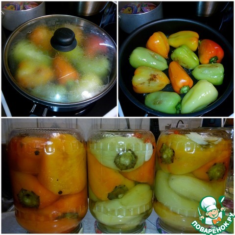 На сайте есть несколько рецептов жареного, консервированного перца, но мой немного отличается, поэтому решила поделится им с вами. Проще консервации сложно себе представить, слегка обжарил, все в банку и залить кипятком прямо из чайника, вот и все! Легко и просто! Но тем не менее получается очень вкусно и красиво смотрится на столе. Порцию даю на одну банку, перца входит туда разное кол-во, зависимо от размера. Крупного и красного входит всего 3 штуки, а вот такого как у меня 4-5 шт. Рецепт дан на 1 л баночку!