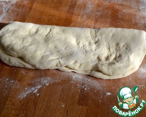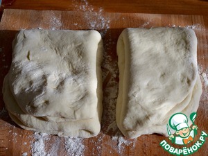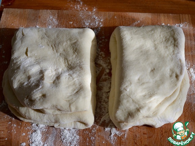 Выложить его на рабочую поверхность, припыленную мукой и разделить на 2 части. Каждую часть теста руками растянуть до формы прямоугольника. Сложить пополам (завернув к себе). Затем развернуть на 90° и снова сложить вдвое.