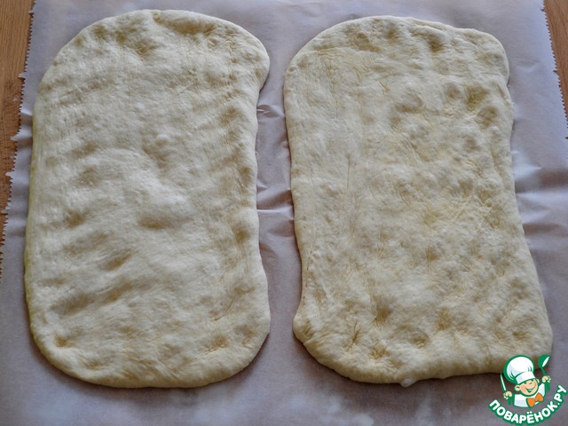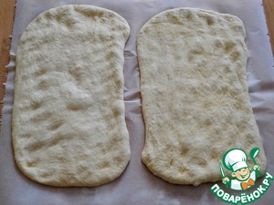 По прошествии указанного времени, руками (можно помочь себе скалкой) сформировать 2 фокаччи. Выложить их на лист пекарской бумаги, снова накрыть полотенцем и оставить еще на 1 час.