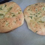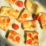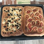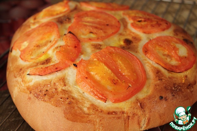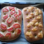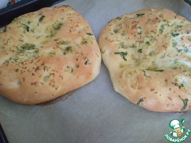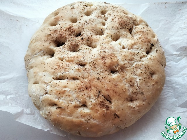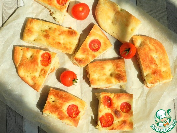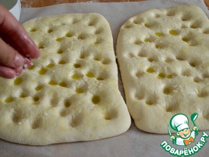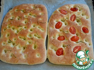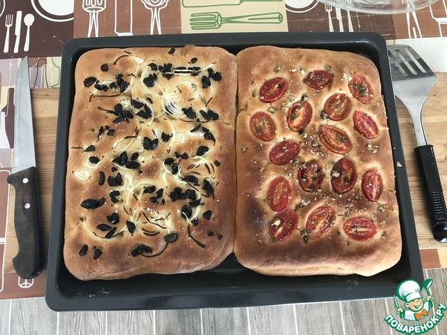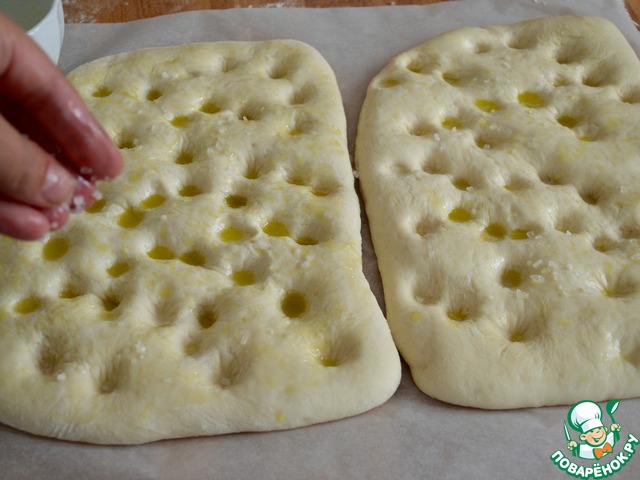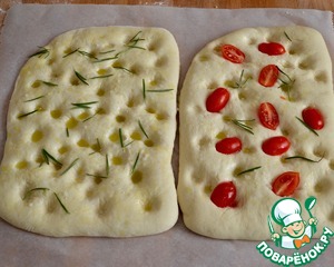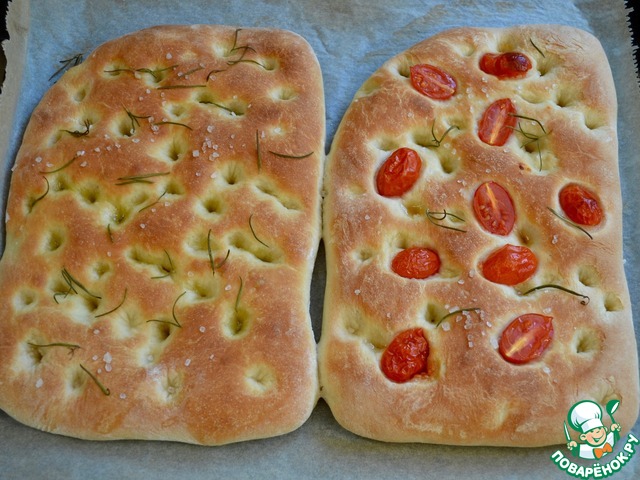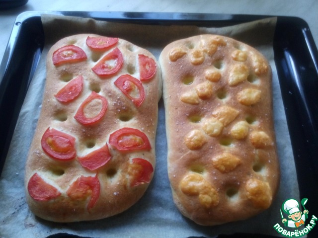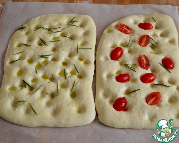Переносим аккуратно обе фокаччи на листе пекарской бумаги на противень и выпекаем в горячей духовке 13-15 минут до золотистого цвета. Дать остыть на решетке и подавать!