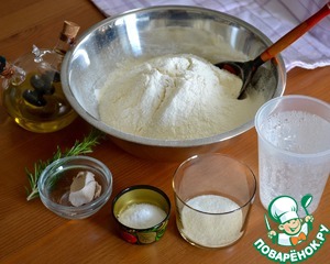 Для приготовления фокаччи на минеральной воде нам потребуется такой простой набор продуктов; мука, сильногазированная минеральная вода (комнатной температуры), свежие прессованные дрожжи, сахар, соль, оливковое масло, а также 2 веточки свежего розмарина и крупная соль.