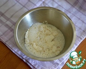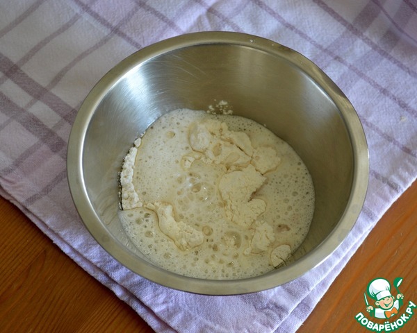 Дрожжи смешать с 2 ст. л. муки и сахаром, развести всё с 50 мл воды, как следует размешать и отставить для ферментации на 15 минут.