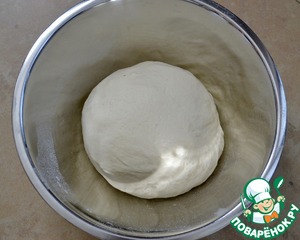 Через 15 минут добавить к дрожжам оставшуюся воду, просеянную муку, а также соль и оливковое масло и замесить тесто. Вымешивать тесто около 10 минут, можно это сделать как вручную, так и с помощью тестомешалки. Выложить в большую миску, смазанную немного маслом, накрыть плёнкой и убрать в тёплое место на 1 час (я ставлю в духовку, включенную в режиме "Свет").