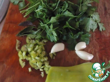 Для заправки порубить чеснок, зелень, горький перец. Перца положила половину, уж очень большой был.