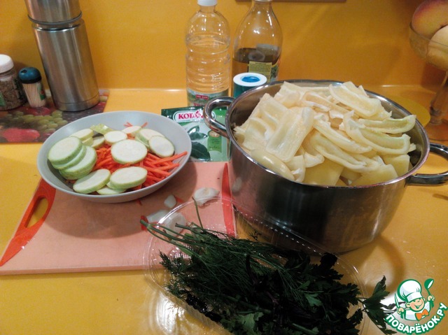 Продукты примерно такие. На один подход к плите перца (очищенного от семян) у меня было чуть больше 2 кг, одна большая морковка и один небольшой кабачок. Все вместе получилось 2,5 кг. Перцы порезала так, чтобы было удобно и быстро закидывать в баночки, морковку натерла соломкой, а кабачок нарезала кружками (пробовала дольками, но не впечатлило), также порезала дольки чеснока, но они у меня гигантские были, если маленькие, лучше оставить целиком. Помыла зелень. Подготовленные овощи отставила в сторону и занялась маринадом.