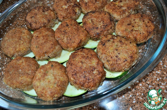 • Сформовать тефтели, обвалять в смеси муки и панировочных сухарей и обжарить на растительном масле до румяной корочки с обеих сторон, по 2-3 минуты. Выложить тефтели на цуккини.