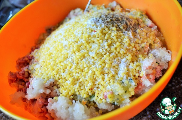 • Вымешать фарш, тщательно отбить. Добавить кус-кус, соль, перец. Вымешать до однородной массы.
