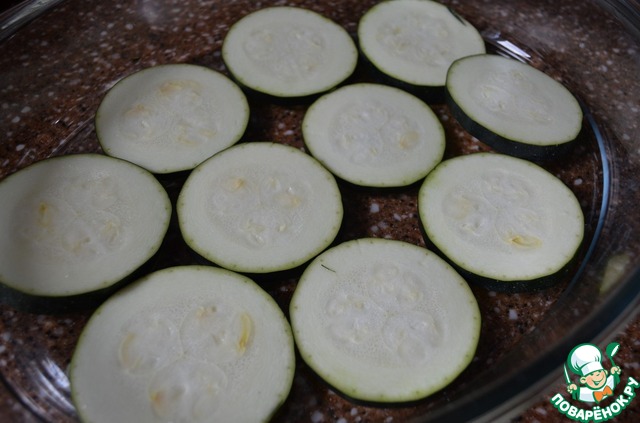 • Цуккини нарезать на шайбы, 1 см., выложить в форму или противень.