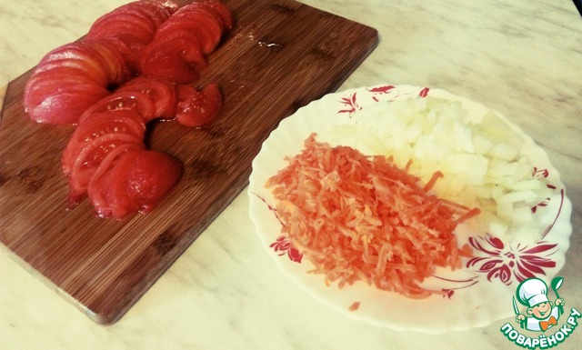 Лук режем кубиком, морковь трем на терке. Помидоры бланшируем, снимаем кожицу и режем дольками (мне так красивее). Можно их нарезать тоже кубиком или натереть - это по желанию.