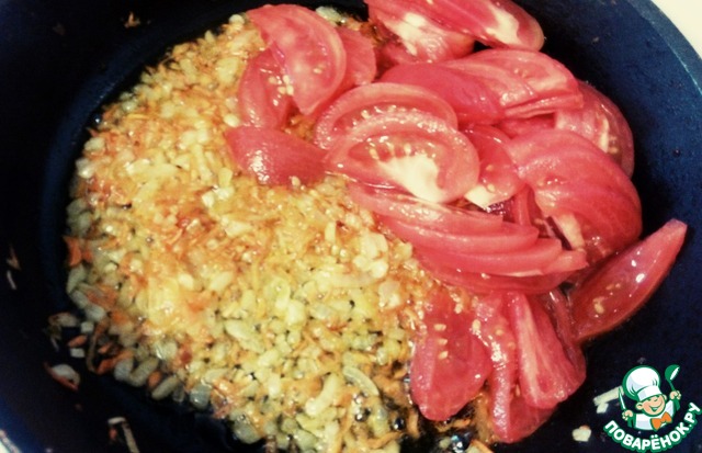 Пассеруем лук с морковью, добавляем помидоры.